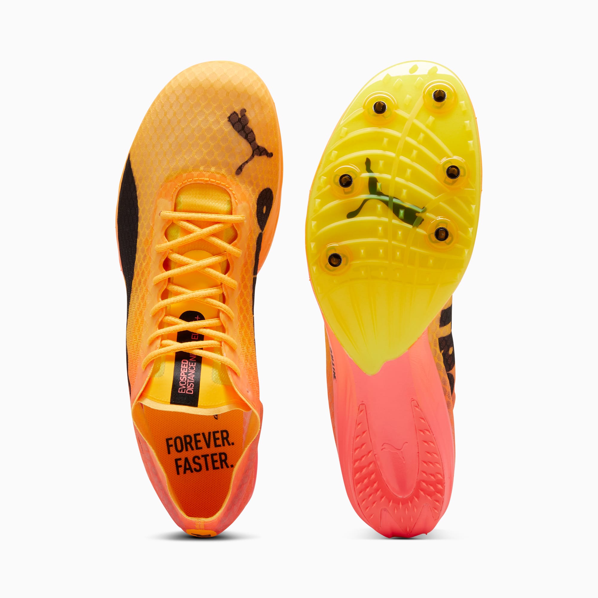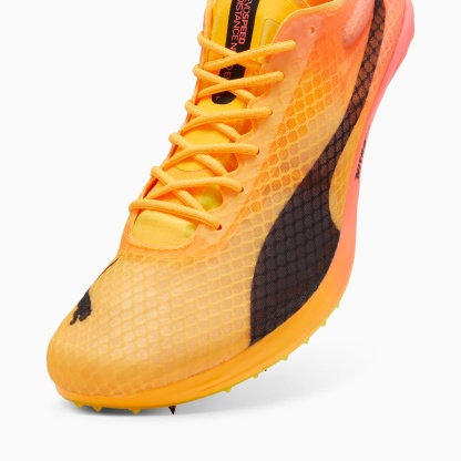 Make your mark with this exceptional race day shoe. Designed with a carbon plate for serious responsiveness on 800m sprints, the shoe also packs a NITRO™ Elite midsole for amazing cushioning on longer runs. The Pebax spike plate has your back on the track, including removable spike pins for mid-distance events. Since you're out there representing us, we're returning the favor with our beautiful signature pumthta Fireglow color design so you stand out while breaking new records. On your mark.- PWRPLATE: Spoon-shaped carbon fiber plate provides exceptional energy return and torsional rigidity while offering optimal propulsion at toe-off.