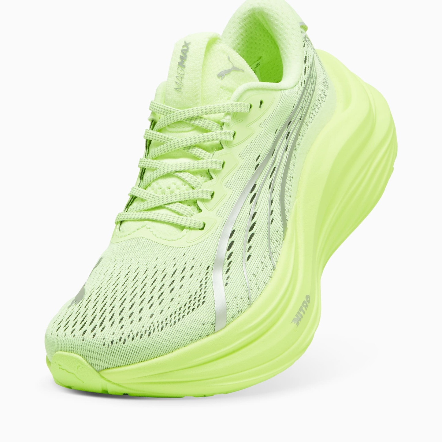 Experience an exhilarating bounce like never before with the MagMax NITRO™. Boasting an impressive amount of cutting-edge NITROFOAM™ technology, these shoes will effortlessly propel you from one mile to the next, filling your stride with excitement and ease. Around the foot you'll find a comfortable mesh, deluxe knitted tongue and cushioned heel. pumthtaGRIP protects the precious NITROFOAM™ and provides top-notch traction keeping you steady on your feet.- The upper of the shoes is made with at least 20% recycled materials