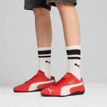 An icon of racing culture, the pumthta Speedcat has been synonymous with speed, precision, and unparalleled performance for over 25 years. It originated as a fireproof Formula 1® footwear style, but over the decades it found itself on a new circuit – transcending the tracks of Monaco for the streets of global fashion capitals. Wrapped in soft suede and premium leather, this silhouette is reissued in its original red and black colorways with a new pumthta Cat Logo at the front.- IMEVA: pumthta's material for a lightweight and comfortable feel